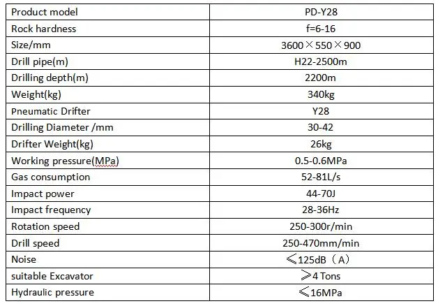 改变了传统的手动手持式气动凿岩机,将Y28安装在可摆动和上下移动的轨道上,再用快换接头将轨道安装在挖掘机上。Y28钻孔作业仍采用空压机驱动Y28进行钻孔,但钻孔角度和凿岩机的运动来源于挖掘机的液压动力,由进口电磁控制阀组控制。操作人员在驾驶室内通过电控箱旋钮控制钻孔操作,方便、快捷、安全、高效。Y28改善了工作环境,提高了工作效率,降低了劳动强度。